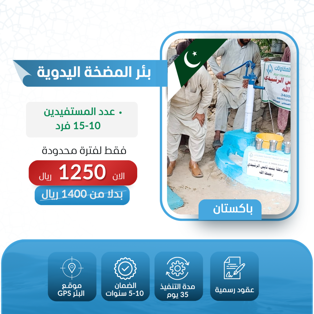حفر بئر في باكستان بالمضخة اليدوية نقوم بحفر بئر سطحي في الباكستان بعمق 30- 50 متر بمضخة يدوية سهلة الاستخدام تكفي لـ 10 حتى 15 فرد، يهدف إلى توفير المياه النقية للمجتمعات التي تعاني من تلوث ونقص المياه.