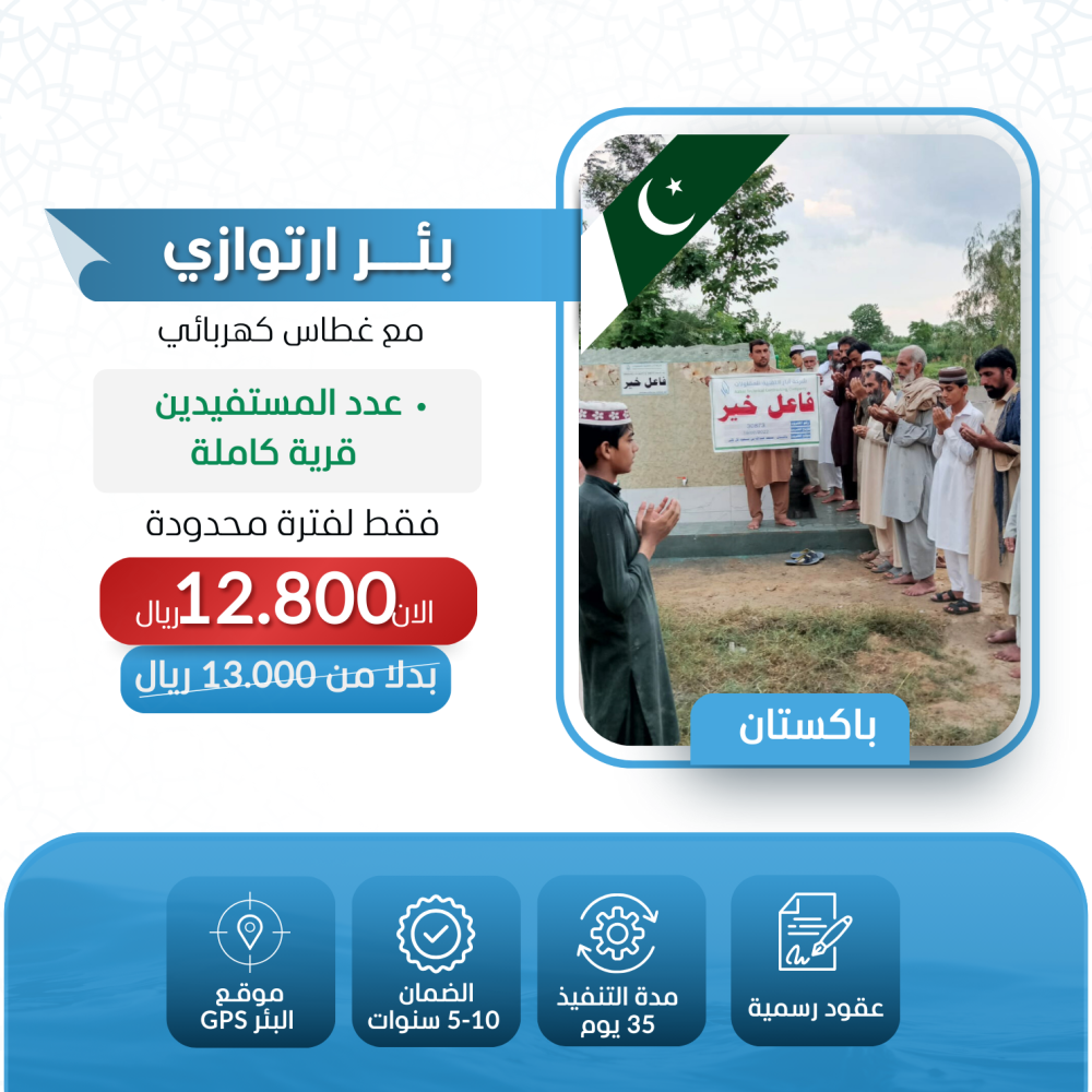 بئر ارتوازي (مع غطاس كهربائي) – باكستان عبارة عن بئر ارتوازي عميق في الباكستان بمضخة كهربائية وعمق يتراوح من 50 - 100 متر تستخرج مياه نظيفة ونقية 100% من أعمق طبقات الأرض،يتميز البئر المضخة الكهربائية بإقامة بناء لمكان استلام المياه وبدون أي مجهود بدني في جلب المياه، موصول مع خزان ماء خرساني لحفظ المياه بأفضل طريقة تحافظ على نظافة المياه من البكتيريا.